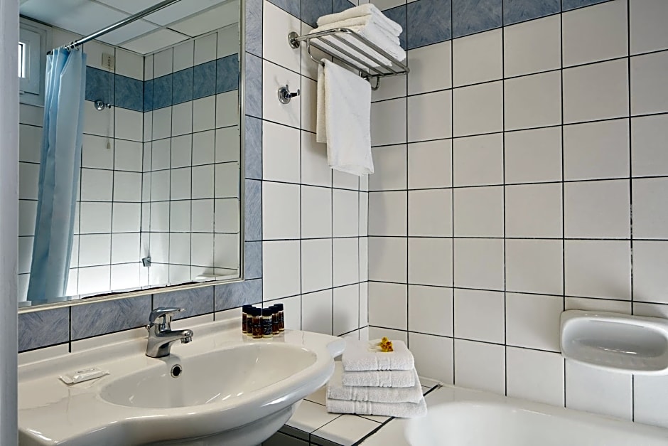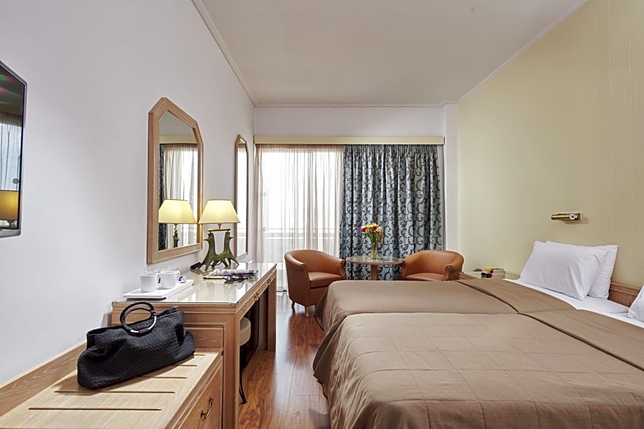 市中心部からわずかに位置するこの4つ星ホテルは、利便性と快適さを両立しています。屋上の屋外プールは爽やかな憩いを提供し、館内のレストラン1では家族向けの雰囲気でギリシャ料理を楽しめるため、みんな一緒の食事に最適です。